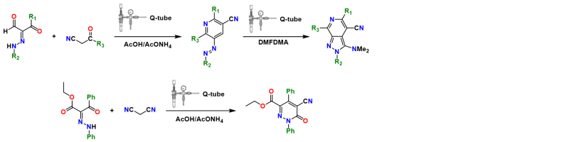 A one-pot two-component reaction of 3-oxo-2-arylhydrazones with active methylene nitriles under high pressure in a Q-tube safe reactor was reported. Comparison between conventional and Q-tube safe reactor-assisted synthesis of organic compounds was done by comparing total reaction time and percentage yield. The results show that the compound 5-cyano-6-oxo-1,4-diphenyl-1,6-dihydro-pyridazine-3-carboxylic acid ethyl ester (3) was synthesized within 2 h in a yield of 97%. In addition, the pyrazolo[3,4-c]pyridines 5b and 5c were obtained in yields of 93 and 95% within 1 h reaction time, respectively. The obtained results suggest that Q-tube safe reactor-assisted syntheses were led to higher product yields within very short reaction times.