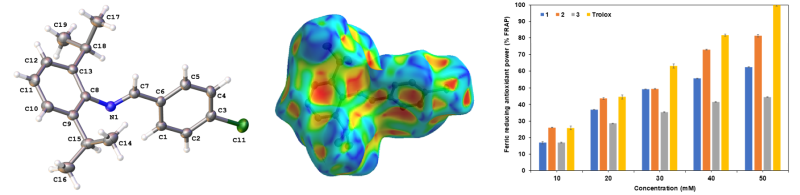 Three Schiff bases 1-(4-chlorophenyl)-N-(naphthalen-1-yl)methanimine (1), 1-(4-methoxy phenyl)-N-(naphthalen-1-yl)methanimine (2), and 1-(4-chlorophenyl)-N-(2,6-diisopropyl phenyl)methanimine (3) were synthesized and characterized by elemental analysis, 1H and 13C NMR, FT-IR and UV-Visible spectroscopic techniques. The crystal structure of compound 3 was obtained and it revealed that the compound crystallized in a monoclinic space group P21/n and there exists an intermolecular hydrogen bond in a phenyl-imine form with C-H⋯N. Crystal data for C19H22ClN: a = 7.28280(10) Å, b = 9.94270(10) Å, c = 24.0413(2) Å, β = 97.0120(10)°, = 1727.83(3) Å3, Z = 4, μ(Mo Kα) = 0.215 mm-1, Dcalc = 1.1526 g/cm3, 14038 reflections measured (12.42° ≤ 2Θ ≤ 52.74°), 3448 unique (Rint = 0.0223, Rsigma = 0.0182) which were used in all calculations. The final R1 was 0.0337 (I≥2u(I)) and wR2 was 0.0927 (all data). The free radical scavenging activities of all three compounds were assayed using DPPH, FRAP, and OH assays. According to results obtained, compound 2 shows effective DPPH- (IC50 = 22.69±0.14 μg/mL), FRAP+ (IC50 = 28.44±0.12 μg/mL), and OH- (IC50 = 27.97±0.16 μg/mL) scavenging activities compared with compounds 1 and 3 but less than standard antioxidant compound Trolox (TRO). Additionally, theoretical calculations for the three complexes were performed by using density functional theory (DFT) calculations at the B3LYP/6-31++G(2d,2p) level in the ground state to obtain an optimized geometrical structure and to perform an electronic, molecular electronic potential surface and natural bond orbital (NBO) analysis. The geometrical calculation obtained was found to be consistent with the experimental geometry. Further analysis was conducted using the in silico technique to predict the drug likeness, molecular and ADME properties of these molecules.