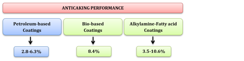 Caking formation in fertilizer products during handling and storage is a frequently encountered problem. Caked fertilizers become together as lumps, lose their free- flowing properties, and create inefficient applications. Several parameters such as relative humidity and temperature of the environment, pressure by pile height, and physicochemical properties of fertilizer product such as moisture content, presence of fines and chemical composition, etc. cause or accelerate caking mechanism. Internal or external anticaking products have been proved to be effective in preventing the caking of fertilizer particles. Liquid or wax anticaking agents are applied externally as coatings on the fertilizer surface. This study focuses on the performance evaluation of commercially available liquid- wax anticaking agents coated on NP 20-20-0 fertilizer, classified as three main groups: petroleum-derived, alkyl amine-fatty acid containing mixtures and bio- based composition. Caking performance of coating products are evaluated via small-bag storage test in 4 sets, according to the results, petroleum derived and alkyl amine- fatty acid containing anticaking products show similar performance, whereas bio-based products’ performance is moderate. This study focuses on a practical approach that will help fertilizer industry about which type of coating product will be effective on the anticaking properties of nitrogenous fertilizers and gives brief results of the effect of commercially available products with various ranges of chemical composition on the caking process.