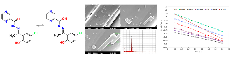 Mononuclear complexes of VO(IV), Cr(III), Fe(III), MoO2(VI), WO2(VI), and UO2(VI) with pyrazinecarbohydrazone ligand (N'-(1-(5-chloro-2-hydroxyphenyl)ethylidene)pyrazine-2-carbohydrazide) were synthesized and the prepared complexes were characterized by elemental analysis, magnetic susceptibility, powder X-ray analysis, various spectroscopic techniques (IR, 1H NMR, 13C NMR, and Mass spectra), SEM, and thermal analysis. VO(IV) complex was additionally characterized by ESR study. The ligand behaves as a dibasic tridentate, coordinating through the phenolate oxygen, azomethine nitrogen, and enolate oxygen atoms towards the central metal ion. The analytical data suggest 1:1 metal to ligand stoichiometry for all complexes. The physicochemical data suggested octahedral geometry to Cr(III), Fe(III), MoO2(VI), WO2(VI), and UO2(VI) complexes while square pyramidal to VO(IV) complex. The SEM analysis indicated the presence of well-defined crystals free from any shadow of the metal ion on their external surface with particle sizes of greater than 10 μm. Various kinetics and thermodynamic parameters are calculated using Coats-Redfern method and on the basis of half decomposition temperature the thermal stability order of complexes was found to be Cr(III) < WO2(VI) < Fe(III) < MoO2(VI) <  VO(IV) < UO2(VI). The solid-state electrical conductivity of compounds was measured in their pellet form in the temperature range form 313-373 K. The conductivity data vary exponentially with the absolute temperature and obey Arrhenius equation indicating their semiconducting behavior. The antibacterial as well as antifungal activities of ligand and its metal complexes were evaluated in vitro against Gram positive bacteria (S. aureus and B. subtilis) and Gram-negative bacteria (E. coli and S. typhi.) and fungal strains (C. albicans and A. niger). The activity data revealed metal complexes are found to be more active than the ligand.