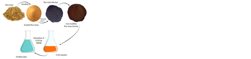 Water pollution caused by heavy metals is of great concern because of rapid industrialization, lack of wastewater treatment, and inefficient removal of these metals from wastewater. The present project was designed to develop a green adsorbent from rice straw and to investigate it for the removal of chromium from chromium-contaminated water. Rice straw biochar was prepared and then modified with FeCl3·6H2O and FeSO4·7H2O to enhance its Cr removal efficiency. Modified and unmodified biochar were characterized by Scanning Electron Microscope (SEM), Energy Dispersive X-ray Spectroscopy (EDS), and Fourier Transform Infrared Spectroscopy (FTIR). Batch sorption experimentations were performed to inquire about adsorption kinetics, isotherms, and Cr(VI) adsorption mechanism onto iron-modified rice straw biochar (FMRSB). The results specified that the apex adsorption capability of the adsorbent for chromium was 59 mg/g and the maximum removal efficacy was 90.9%. Three isotherm models, Sips, Freundlich, and Langmuir models were applied to the experimental data. Among them, the Sips isotherm model reveals the most excellent fitting with a maximum correlation coefficient (R2 = 0.996) that was adjusted to the experimental data. Regarding kinetic studies, the Pseudo second-order (PSO) exhibits the best fitting with a higher correlation coefficient (R2 = 0.996). The kinetic equilibrium data expressed that the adsorption of Cr(VI) on the FMRSB surface was chemisorption. The mechanism of adsorption of Cr(VI) on FMRSB was predominantly regulated by anionic adsorption through adsorption coupled reduction and electrostatic attraction. The present study demonstrated that the use of modified biochar prepared from agricultural wastes is an environmentally safe and cost-effective technique for the removal of toxic metals from polluted water.