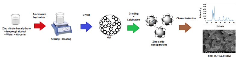 This study reports the base-catalyzed aqueous sol-gel synthesis of zinc oxide nanoparticles. The solution was primarily comprised of zinc nitrate hexahydrate as a metal precursor, isopropyl alcohol and water as solvents, and glycerin as a stabilizing agent. The effect of calcination temperature on the structure and morphology of the prepared nanoparticles was investigated by varying the calcination temperature from 500 to 900 °C. The X-ray diffraction analysis, infrared spectroscopy, thermogravimetric analysis, and field emission scanning electron microscopy were employed to determine the crystal structure, surface functional groups, thermal stability, and surface morphology of the nanoparticles. The particle size was found to be directly proportional to the calcination temperature.