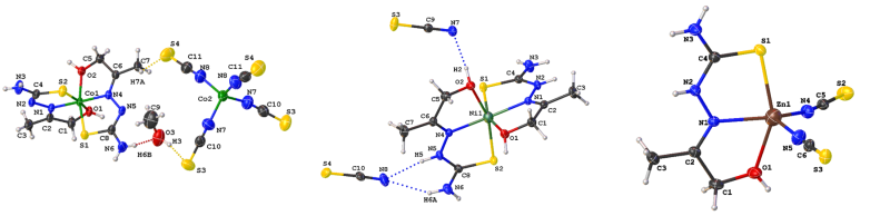 Ndoye, C.; Excoffier, G.; Seck, G. A.; Diouf, O.; Thiam, I. E.; Sidibe, M.; Gaye, M. Crystal Structures of bis[1-(1-Hydroxypropan-2-ylidene)thiosemicarbazide-κ3S,N,O)cobalt(III)-tetra(thiocyanato-κN) cobalt(II) Methanol Solvate, bis{1-(1-Hydroxypropan-2-ylidene)thiosemicarbazide-κ3S,N,O}nickel(II) bis(thiocyanate) and (1-(1-Hydroxypropan-2-ylidene)thiosemicarbazide-κ3S,N,O)bis(thiocyanato-κN)zinc(II). Eur. J. Chem. 2022, 13, 196-205.