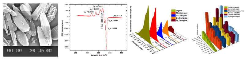 [24]. Shakir, M.; Hanif, S.; Sherwani, M. A.; Mohammad, O.; Al-Resayes, S. I. Pharmacologically significant complexes of Mn(II), Co(II), Ni(II), Cu(II) and Zn(II) of novel Schiff base ligand, (E)-N-(furan-2-yl methylene) quinolin-8-amine: Synthesis, spectral, XRD, SEM, antimicrobial, antioxidant and in vitro cytotoxic studies. J. Mol. Struct. 2015, 1092, 143-159.