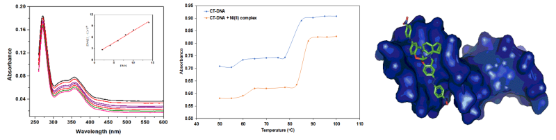 The azo Schiff base ligand was synthesised, along with its Ni(II) complex, by diazotisation of salicylaldehyde with 4-nitroaniline in accordance with the accepted literature approach. Using a variety of spectroscopic techniques, the resulting complex is analysed both quantitatively and qualitatively (Elemental analysis, FT-IR spectroscopy, UV-VIS spectroscopy, 1H NMR, etc.). Spectral measurements of the complex revealed a mole ratio of 1:1. The non-electrolytic nature of the complex is confirmed by molar conductance investigation. The unique azo compound had a tetrahedral shape as a result of the tetra coordination of two phenolic oxygen and two imine nitrogen. The ability of the metal complexes to bind DNA was examined using absorption spectroscopy, fluorescence spectroscopy, viscosity tests, and thermal denaturation methods. Experimental research suggests that complexes bind to DNA through intercalation.