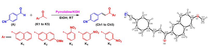 Chalcones are versatile scaffolds for the synthesis of various heterocyclic systems with commercial utility. This work describes the synthesis of five novel chalcone derivatives. Syntheses were performed by a simple one-pot, straightforward Claisen-Schmidt condensation catalyzed with pyrrolidine and KOH. The chalcones were prepared by condensation of 4-formylbenzonitrile with different aromatic ketones at room temperature. The structures of all compounds have been investigated by FT-IR, NMR, and HR-MS spectroscopy. In addition, one chalcone structure was characterized by single-crystal XRD study. Crystal data for C21H15NO2 (Ch2): monoclinic, space group P21/c (no. 14), a = 6.5694(3) Å, b = 33.2697(15) Å, c = 7.4516(4) Å, β = 97.563(2)°, V = 1614.47(14) Å3, Z = 4, T = 293(2) K, μ(MoKα) = 0.083 mm-1, Dcalc = 1.289 g/cm3, 16000 reflections measured (4.898° ≤ 2Θ ≤ 49.99°), 2822 unique (Rint = 0.0249, Rsigma = 0.0196) which were used in all calculations. The final R1 was 0.0484 (I > 2σ(I)) and wR2 was 0.1257 (all data). The absorption maxima of all novel products were evaluated by UV-visible spectroscopy. These well-established structures of all newly prepared chalcone scaffolds with reactive functional groups (i.e. nitrile and 2-propenone) can be exploited as a crucial intermediate in the synthesis of new heterocyclic scaffolds with fluorescence and other applications.